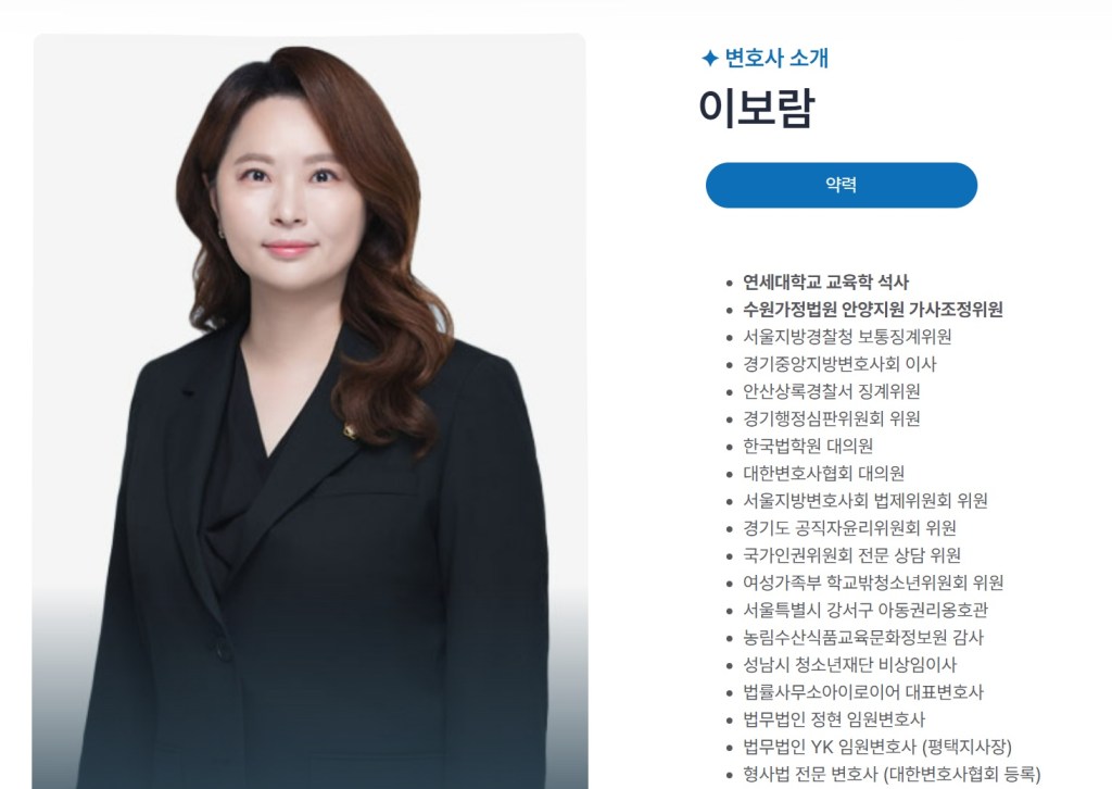 그리고 이보람변호사는 한 사람의 변호사로서 초기 상담부터 판결 확정, 사후 관리에 이르기까지 단 한 번도 담당자가 바뀌지 않는체제를 지향해 오고 있습니다. 사건을 맡길 때마다 새로이 담당자가 바뀌어야 하는 불안감을 철저히 제거하기 위해, 매달 신규 사건 수임은 5건 이내, 전체 사건 수임은 15건 이내로 제한하여 한 사건 한 사건에 충분한 시간과 정성을 쏟을 수 있도록 운영하고 있습니다. 이 과정에서 가정법원 이혼조정위원, 경기도행정심판위원회 위원, 서울지방경찰청 징계위원 등 공공·민간 위원회 활동을 통해 쌓은 중재·조정 노하우를 그대로 적용하여, 아동·청소년 보호법 위반, 학교폭력, 가정폭력 임시조치 등 민감한 사안에서도 의뢰인의 심리적 부담과 정서적 상처를 최소화하는 맞춤형 해결책을 제공합니다.