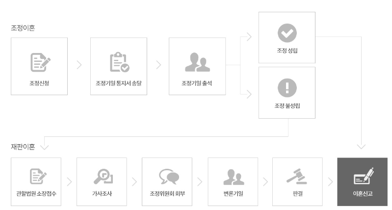 - 조정신청 : 재판상 이혼을 하려고 하는 사람은 우선 가정법원에 조정신청을 하여야 합니다 (조정을 우선하는 조정전치주의).