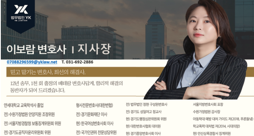 법무법인 YK 지사장 부동산전문변호사 법률정보 민사법/형사법 전문변호사 부지사장 이동호 변호사 손해배상/부동산전문 24시간 상담문의 010-3909-1504 주말/공휴일 방문상담 가능