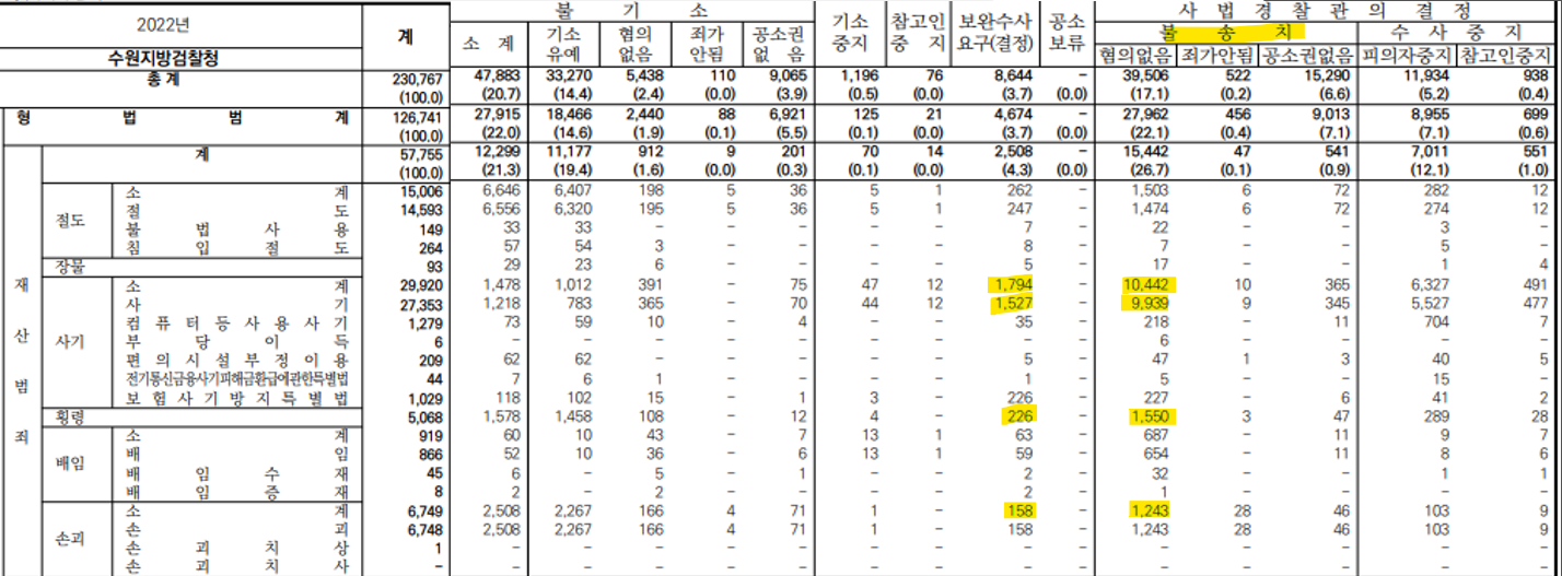 대검찰청통계자료, 수원지방검찰청의 사기 등 재산범죄 불송치, 보완수사 현황