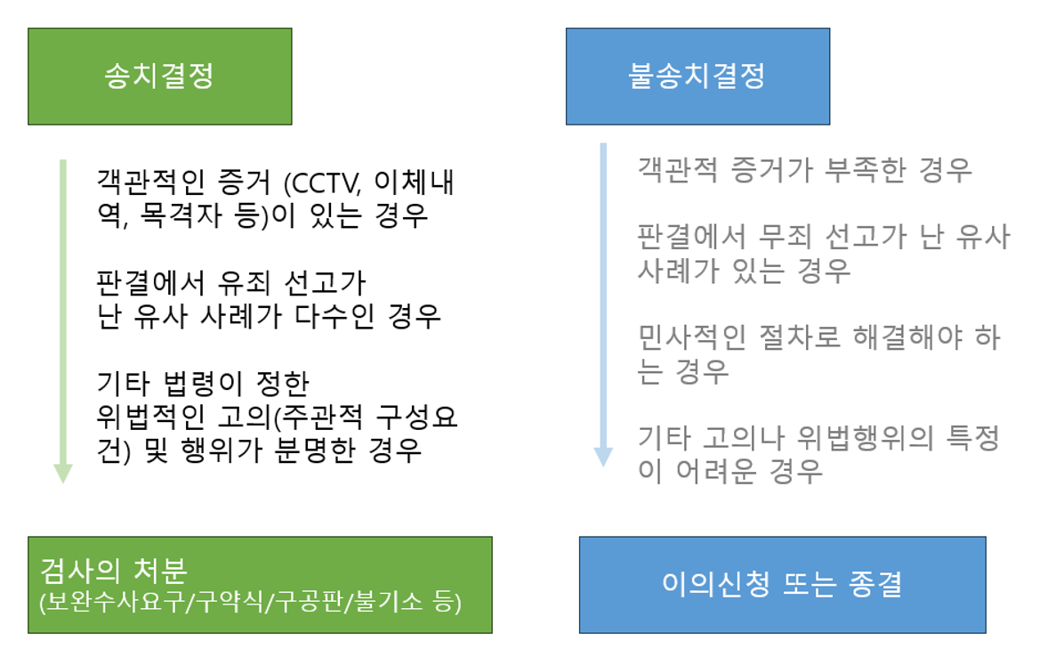 모든 경우를 일률적으로 설명할 수는 없지만 평택형사전문변호사로서의 경험으로 볼 때 다음과 같이 객관적인 증거 (CCTV, 이체내역, 목격자 등)이 있는 경우,판결에서 유죄 선고가 난 유사 사례가 다수인 경우, 기타 법령이 정한 위법적인 고의(주관적 구성요건) 및 행위가 분명한 경우에 있어서 송치결정이 되고 있습니다.